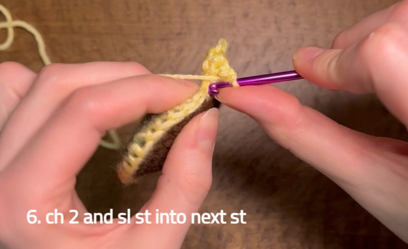 Round 7: align the green and brown circles with the back sides facing one another once again. Insert hook through one st on both circles. Join yellow yarn here. Ch 1 time to join circles. Sc in same st. Sc around the edges to join the circles. Before joining completely, slightly stuff the circles with either the stuffing or the yarn ends. Sc the rest of the way. Sl st into the first sc (30)