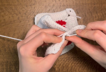 Sl st 2 squares and 2 squares together with white yarn, in first picture. (Usually on projects you will sl st the pieces together so the joining seam is on the inside, but for this project we will have the joining seam on the outside) Connect both sides of the squares, not the top and bottom! Leave a thumb hole on one side. To do this you will want to sl st part way down connecting both, in second top picture. I connected 4 st, then sl st down one square for 6 st (in bottom left corner), before connecting again to finish connecting the squares (bottom right corner).