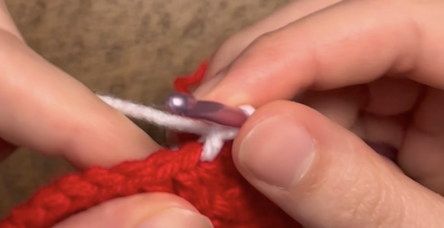 Round 1: with red yarn, ch 2 and 11 sc into MR, sl st into top of ch 2 (12)